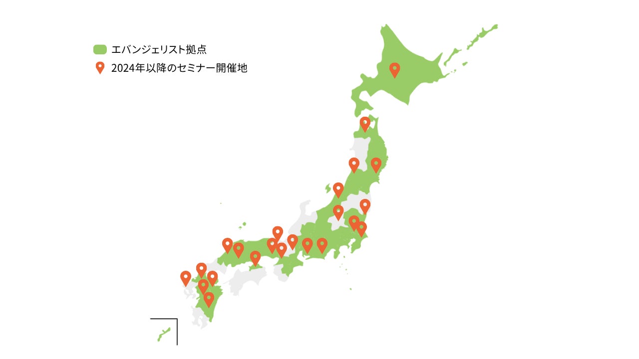 直近1年間のセミナー開催地(23都市):北海道、青森県、宮城県、山形県、茨城県、千葉県、東京都、新潟県、静岡県、愛知県、滋賀県、京都府、兵庫県、大阪府、島根県、広島県、香川県、福岡県、大分県、熊本県、長崎県、宮崎県、群馬県