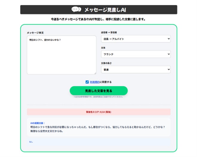店舗管理者・アルバイト従業員双方が利用可能です。送信者の立場を選択し、伝えたいメッセージ内容を入力するだけで、AIが相手への配慮とビジネスマナーを兼ね備えた適切な文章を生成します。