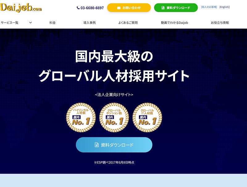 ■グローバル人材向けの転職サイトDaijob.comが、新たに法人向け採用情報サイトをオープン ■外国・日本人バイリンガル人材の採用を強化したい企業を対象に、採用活動に役立つ情報を積極的に発信 ■Daijob.comのサービス紹介をはじめ、グローバル人材の採用成功事例インタビューや採用活動のノウハウ紹介記事などを公開 |