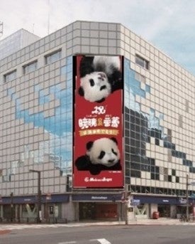 上野の街の顔!?である松坂屋上野店の上野広小路交差点側外壁の広告幕(懸垂幕)に、「シャオシャオ」「レイレイ」が初登場!