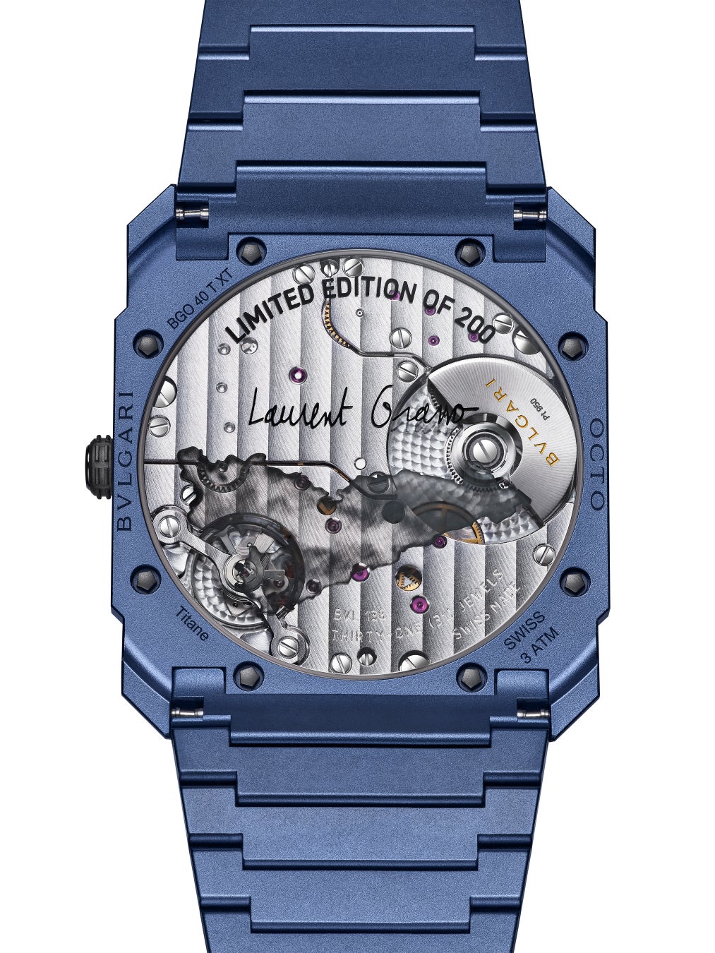 世界限定200本のこのウォッチには、ユニークなブルーにマッチした、エレガントなブルーのスペシャルボックスが付属しています。ケースの内側には、ローラン・グラッソのサインとブルガリのロゴが入れられています。
