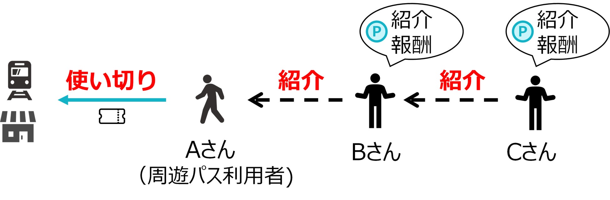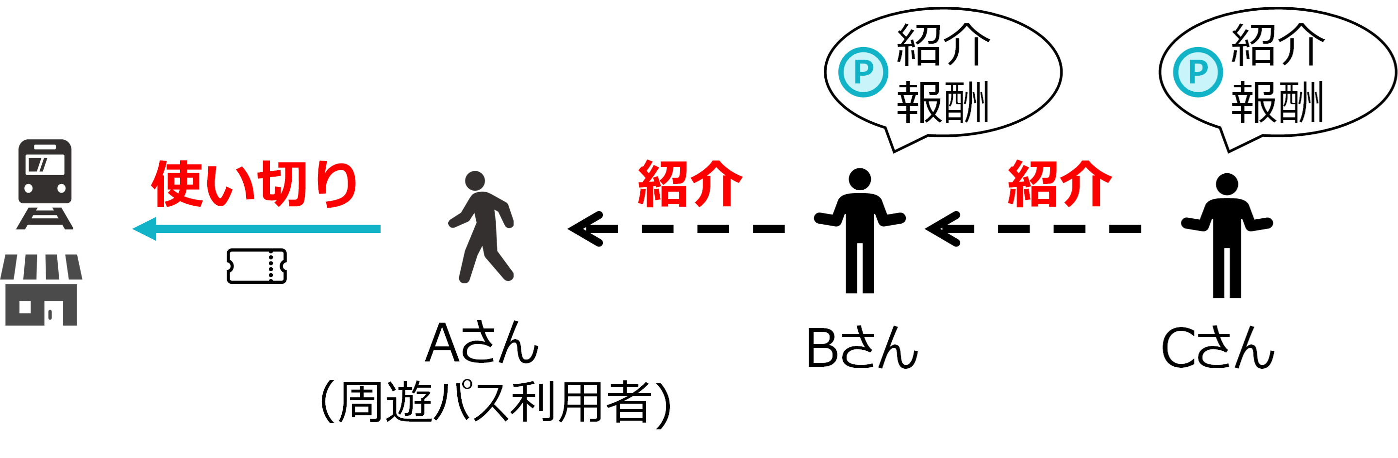 ① Bさんの紹介でAさんが周遊パスを購入(BさんはCさんの紹介で過去に購入)