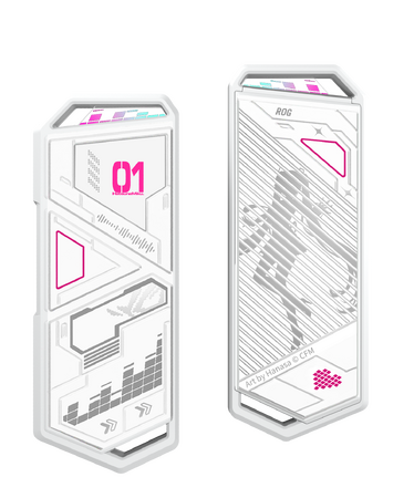 ブルーグリーン、ホワイト、ピンクのカラーでミクのデジタルな個性とROGのゲーム性を融合しました。片面には回路モチーフや「01」ID、波形バー、もう一方にはミクのシルエットラインアートをデザインし、ROG&初音ミク両ブランドのロゴ入りストラップとクロームRフック付きです。サイバーパンクな美しさが際立ちます。2230/2242/2260/2280 M.2 PCIe NVMe SSDに対応し、工具不要で簡単にセットアップ可能でアルミ合金筐体&サーマルパッドで高い放熱性も実現します。