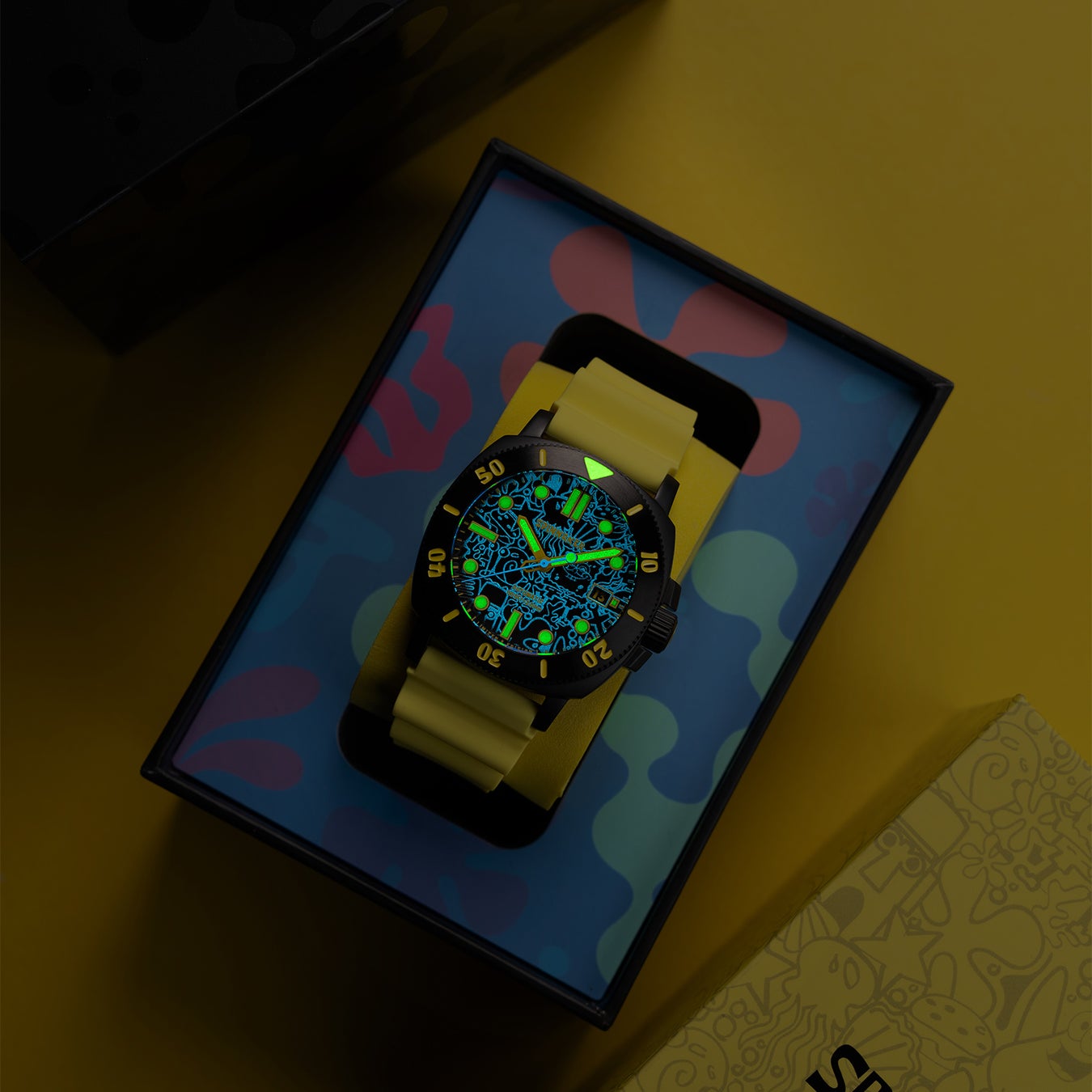 ハルオートマティック スポンジ・ボブ リミテッドエディションの最大の特徴は、文字盤にあります。ブランドネームや日付、機能表示に、『スポンジ・ボブ』の世界で使われているような楽しげなフォントを採用。さらに薄暗く描かれたグラフィック……実はUVライトを照らすことで、架空の海底都市「ビキニタウン」で笑顔を見せるスポンジ・ボブの姿が浮かび上がるのです。それはまるで、深海に隠された宝物のようにも見えます。