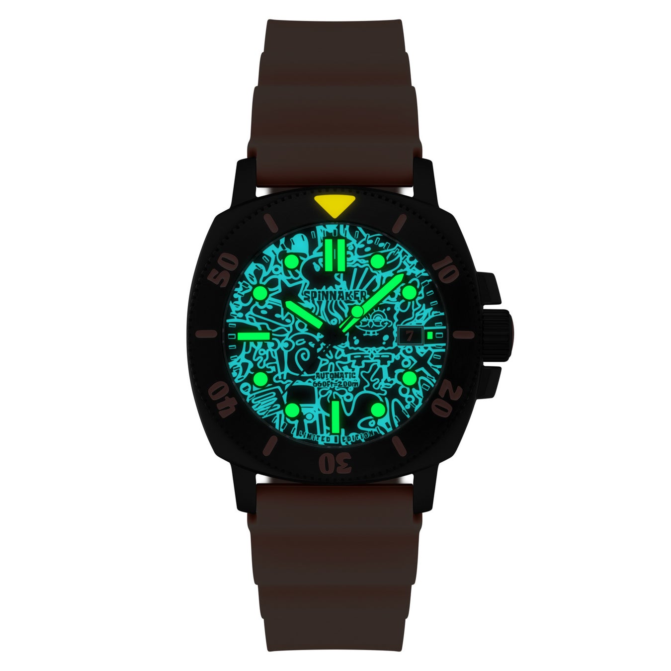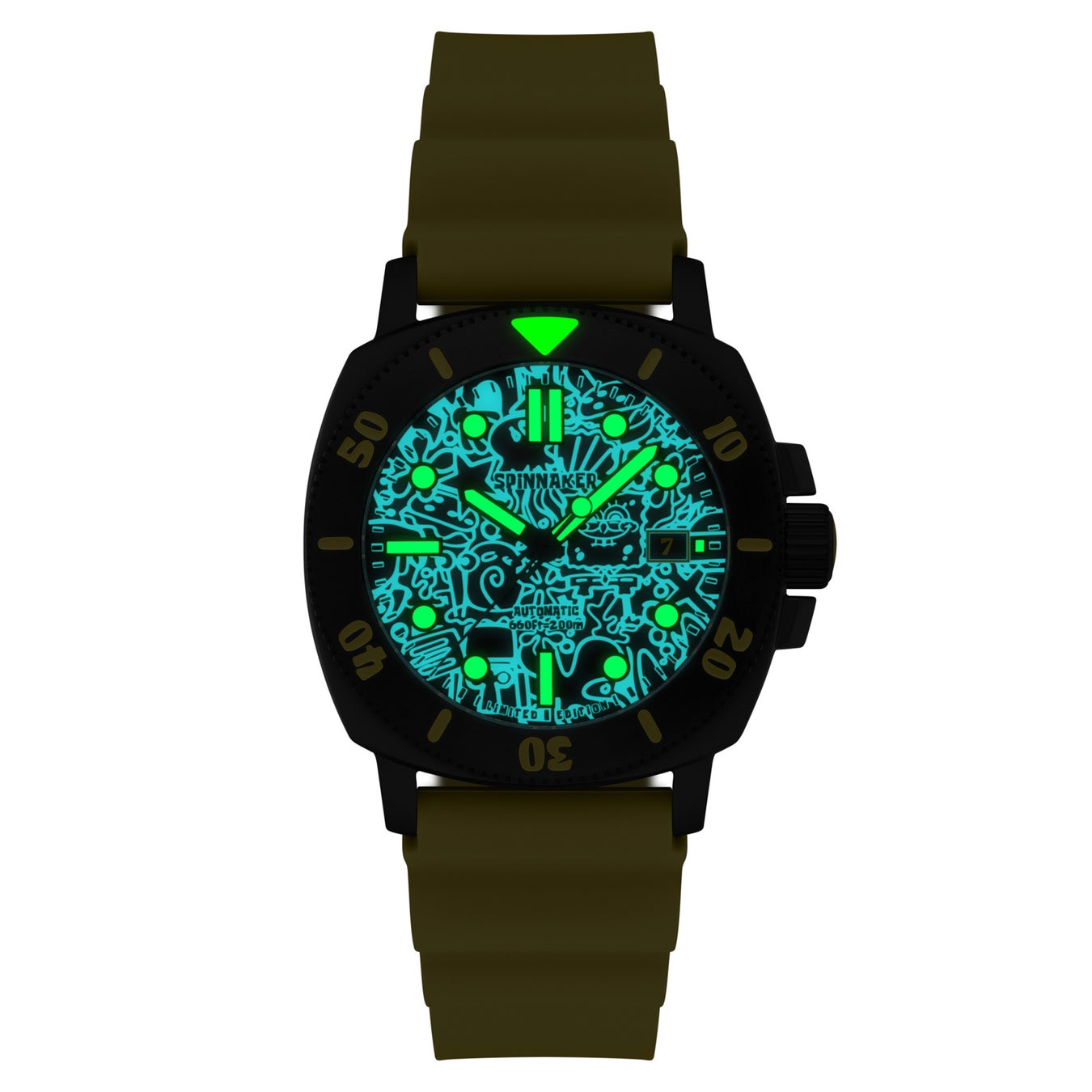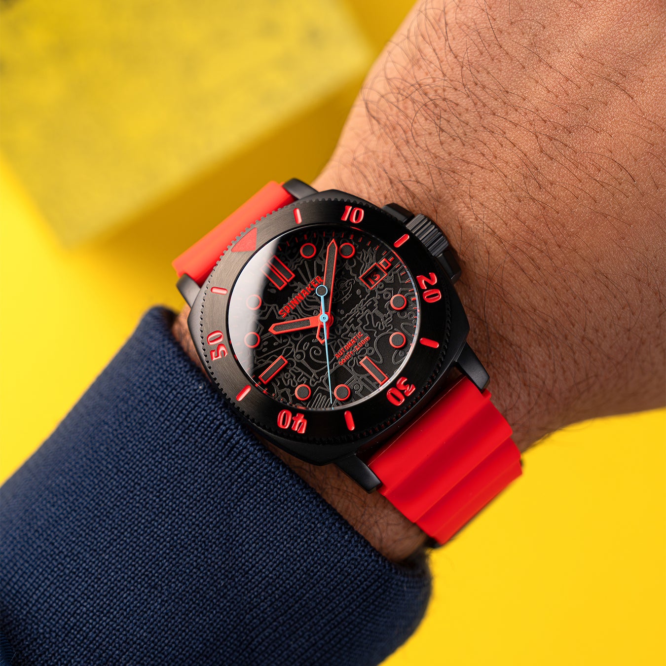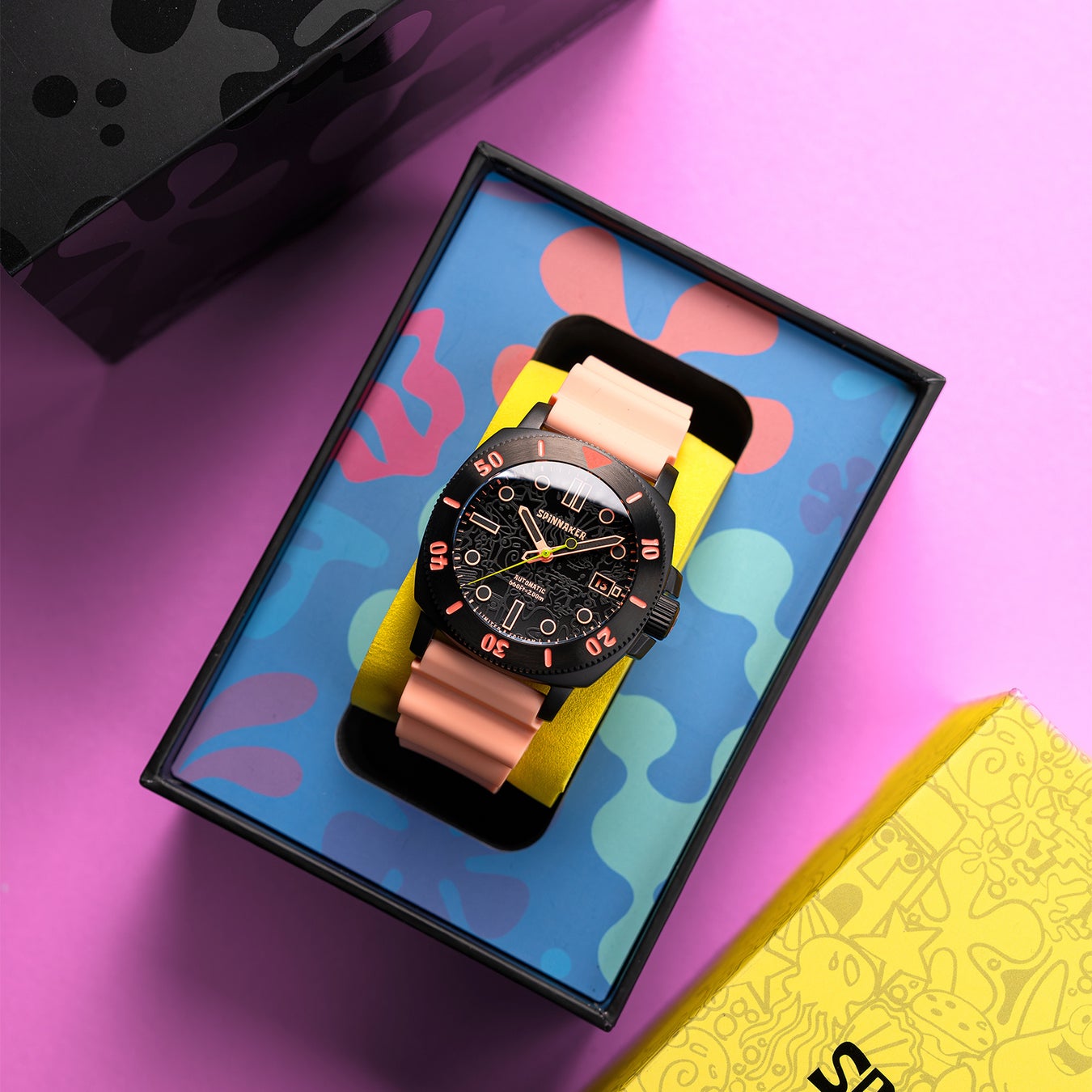 ハルオートマティックが『スポンジ・ボブ』コラボにふさわしい理由は、堅牢で実用的なダイバーズだという事実も挙げられます。200m防水と、深海で暮らす彼らに会いに行けそうなほど高い防水性を実現しています。また風防には耐傷性に優れたサファイアレンズを採用し、キズがつきにくくなっています。シリコンストラップは水に強く、マリンスポーツなどアクティブなシーンでの利用にもうってつけです。