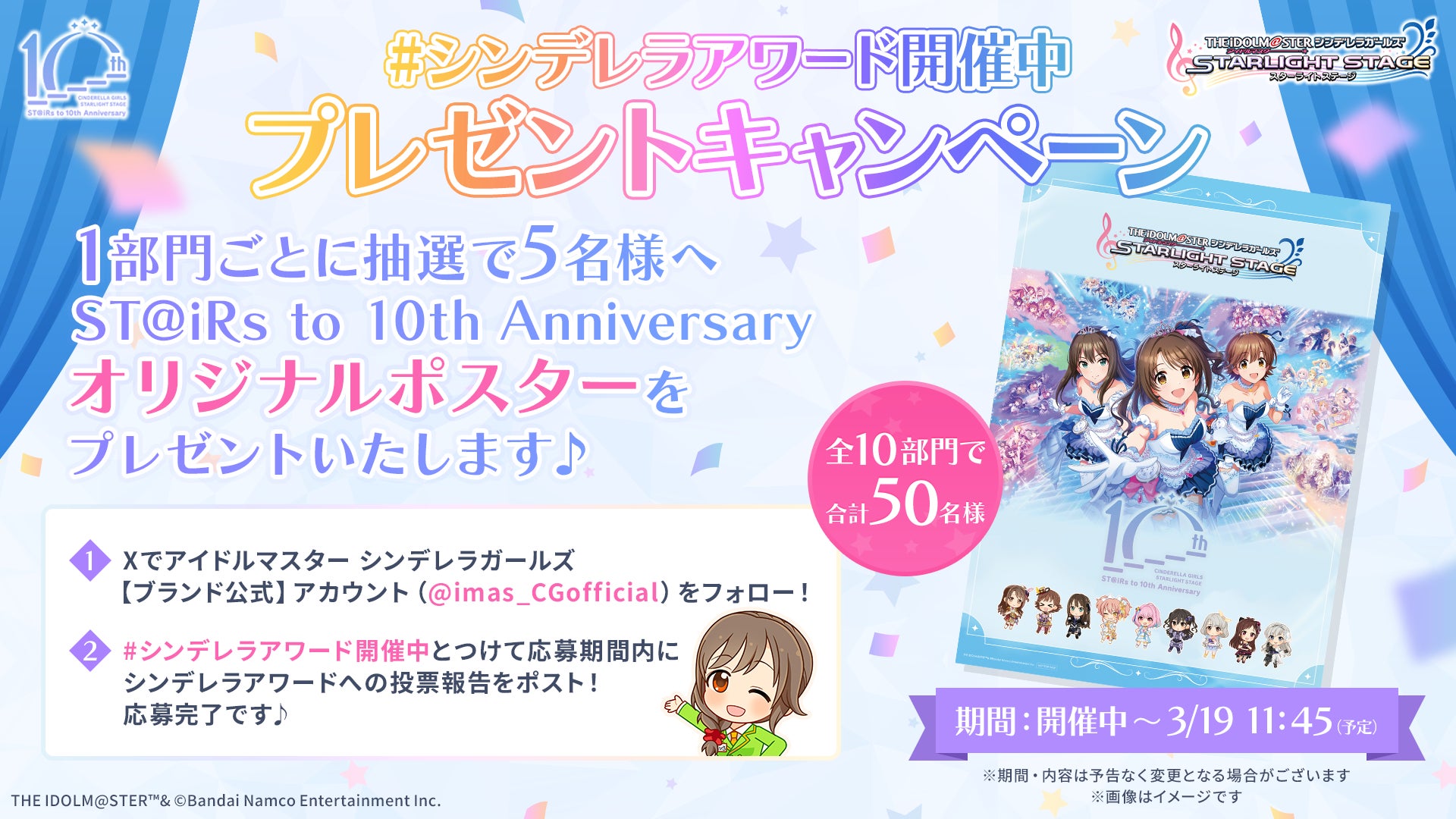 期間中に「シンデレラアワード」に投票して、X(旧:Twitter)でアイドルマスター シンデレラガールズブランド公式アカウントをフォローし、「#シンデレラアワード開催中」とハッシュタグをつけてX上にポストいただいた方の中から、「ST@iRs to 10th Anniversary オリジナルポスター」を合計50名様にプレゼント!
