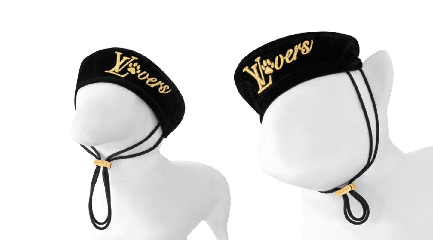 ブラックベルベットで仕立てたハットには、ゴールドカラーの「LV Vers」の文字とシグネチャーの肉球のモチーフがあしらわれています。ペットの頭部に快適かつしっかり装着可能な伸縮性のあるストラップ付き。散歩中の会話が弾む、愛犬にぴったりの陽気なアイテムです。