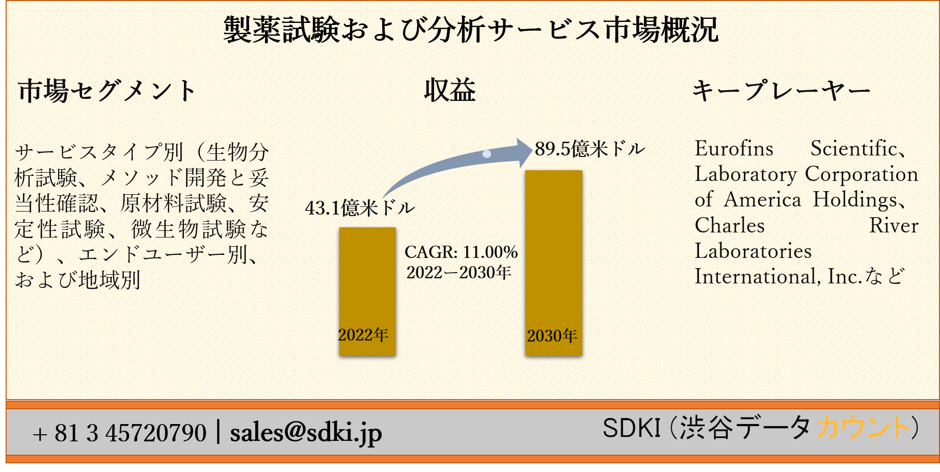 SDKI Inc.が「世界の製薬試験および分析サービス市場ー予測2022ー2030年」の新調査レポートを2021年12月28日に発刊しました。レポートは、業界の新ビジネスチャンスとともに、市場とその成長見通しの完全な評価を提供します。さらに、2022ー2030年の予測期間中の市場規模と年間成長率が含まれています。