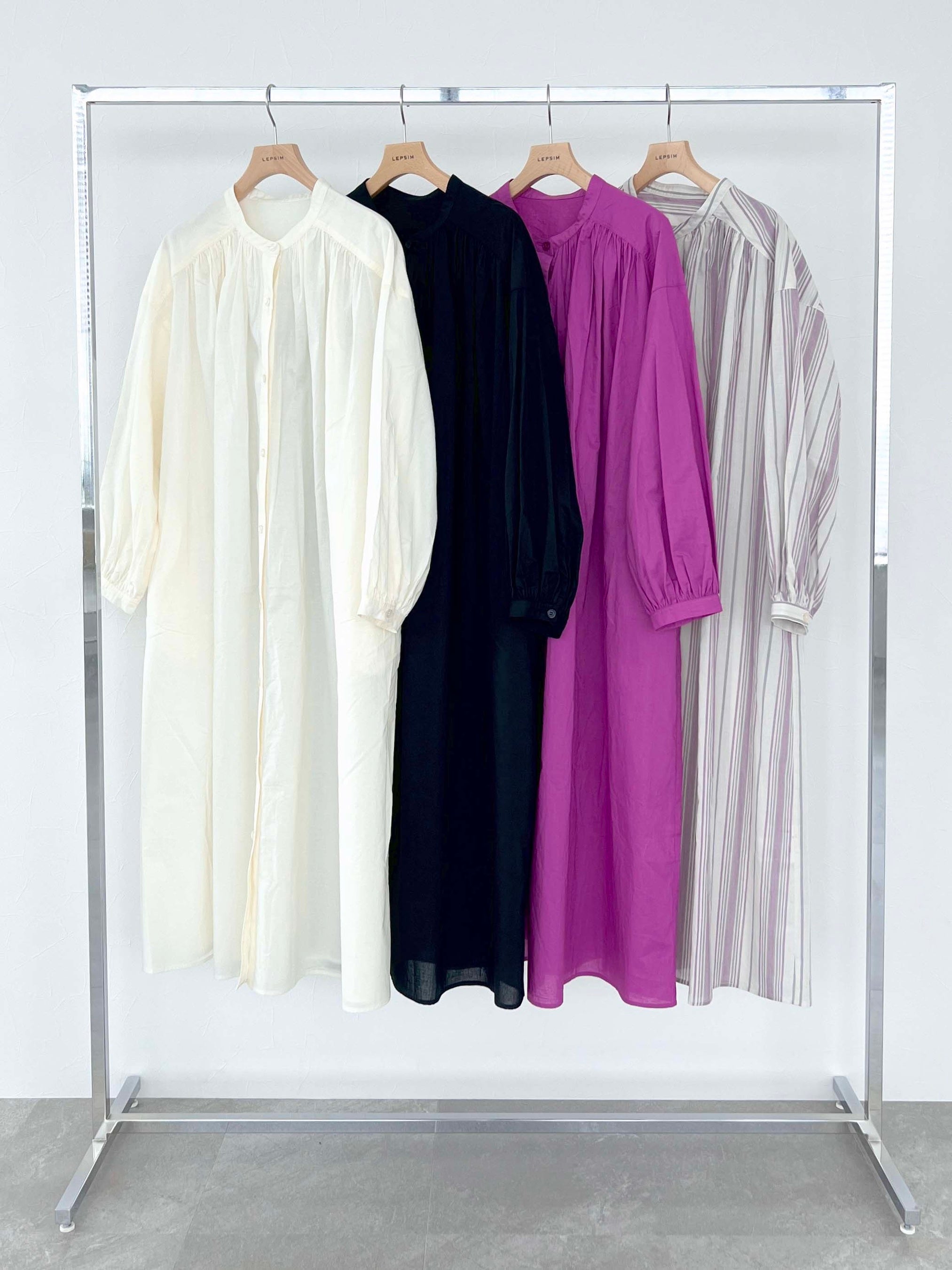ギャザーをたっぷり入れ、ふんわりとした女性らしいシルエットのワンピース。1枚でサラリと着るのはもちろんのこと、ボトムスとレイヤードを楽しむのもおすすめ。前開きデザインなので羽織りとしても活躍してくれます。