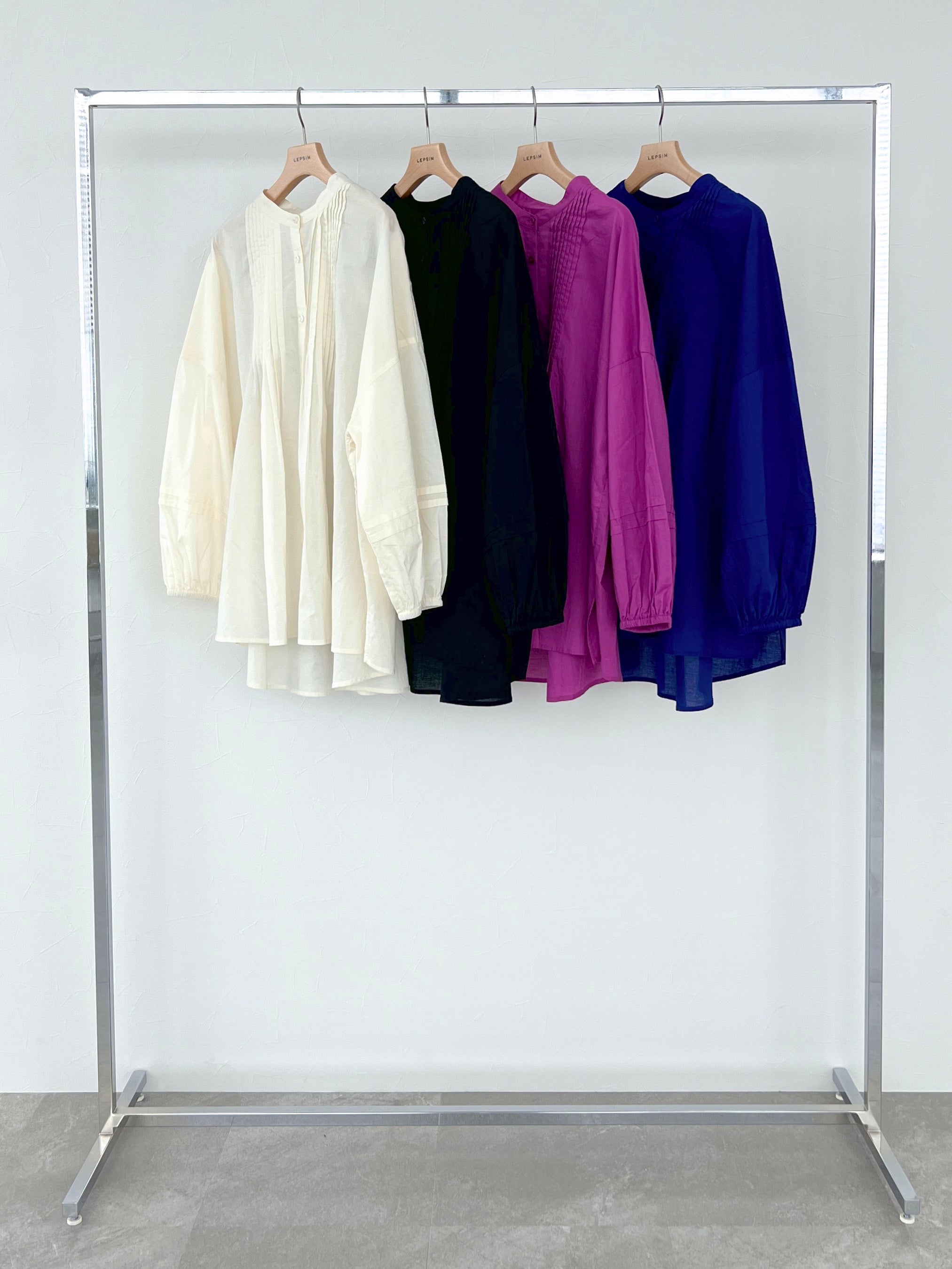 フロントと袖口のタックが上品な印象のデザインブラウス。袖口にゴムが入っているので腕まくりしてボリュームを出して着るのもおすすめです。スタンドカラーのクラシカルな雰囲気ですがカジュアルな素材なので日常使いしやすいアイテム。