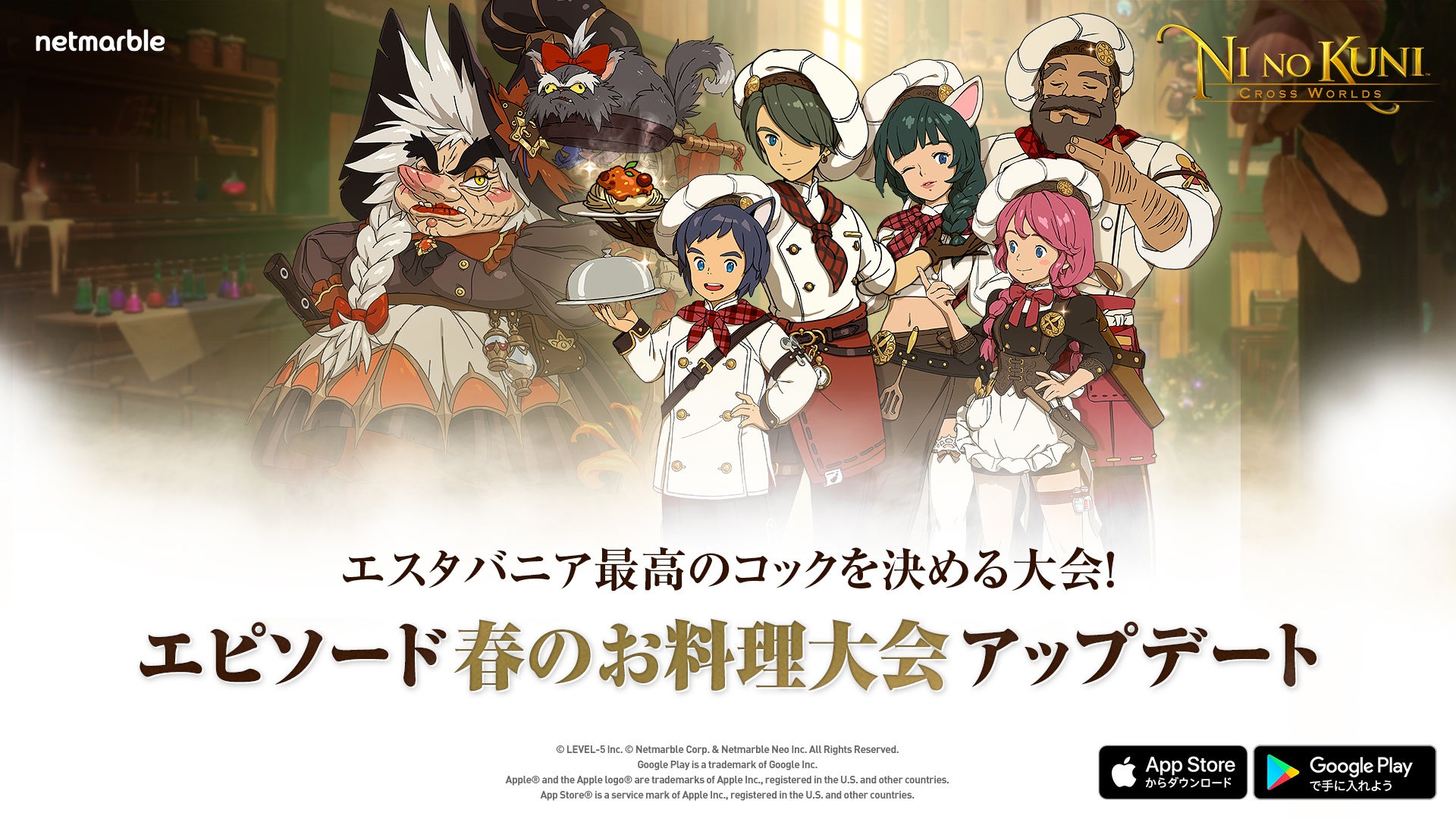 ネットマーブルは、レベルファイブとタッグを組みスマートフォン向けに開発したファンタジーアートRPG『二ノ国:Cross Worlds』(略称:ニノクロ)において、本日3月24日(木)に、新エピソード「春のお料理大会」を追加するアップデートを実施いたしました。また、新エピソードと連動する新システムや新コンテンツを多数追加したことも併せてお知らせいたします。