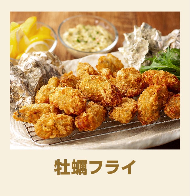 プリッとした牡蠣を軽やかな衣で包み込んだ逸品。カリッとした食感と共に口の中で広がる牡蠣の濃厚な旨みを、タルタルソースやレモンをかけてお楽しみください。