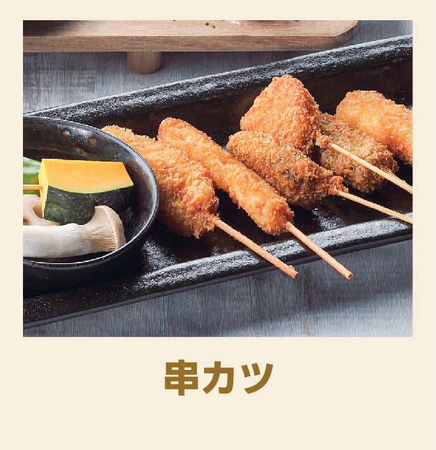 さまざまな食材を串に刺し、衣をつけて揚げた大阪名物の串カツ。外はカリッと、中はジューシー。甘辛いソースをたっぷりとかけてお召し上がりください。