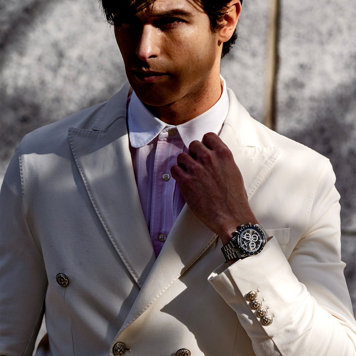 スポーティな中に現代的なセンスを感じるのは、色彩や仕上がりに秘密があります。文字盤はあえて抑制的に仕上げ、全体をモノトーンで統一。さらにコントラストを効かせた“パンダ”サブダイヤルを用いることで、都会的なムードに引き立てています。
