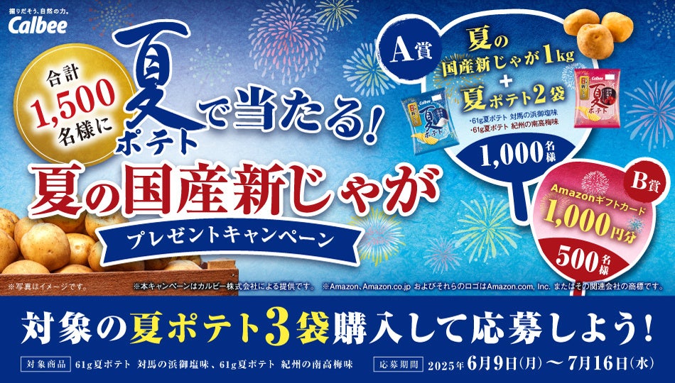 カルビー株式会社(本社:東京都千代田区、代表取締役社長兼CEO:江原 信)は、穫れたてのみずみずしい国産の新じゃがのみを使った、この季節にしか味わえない特別な厚切りポテトチップス『夏ポテト 紀州の南高梅(なんこううめ)味/対馬の浜御塩(はまみしお)味』を2025年6月9日(月)から全国で期間限定発売します(2025年9月中旬終売予定)。