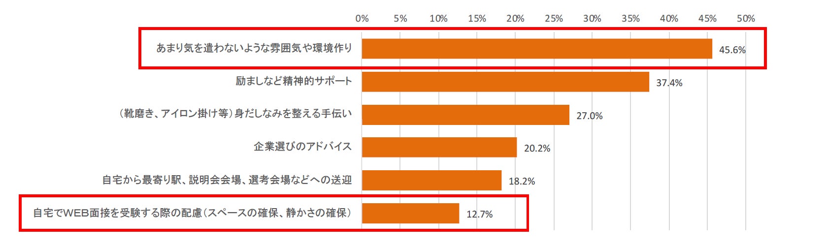 就職活動に対するサポートについて、どちらかというと「親側から自発的に行ったもの」で最も多かったのは「あまり気を遣わないような雰囲気や環境作り」で45.6%であった。「自宅でWEB面接を受験する際の配慮(スペースの確保、静かさの確保)」という回答は12.7%で、コロナ禍によりオンラインで面接を自宅で受ける学生が増えたことを背景に、新しいサポートの形が見られた。【図1】