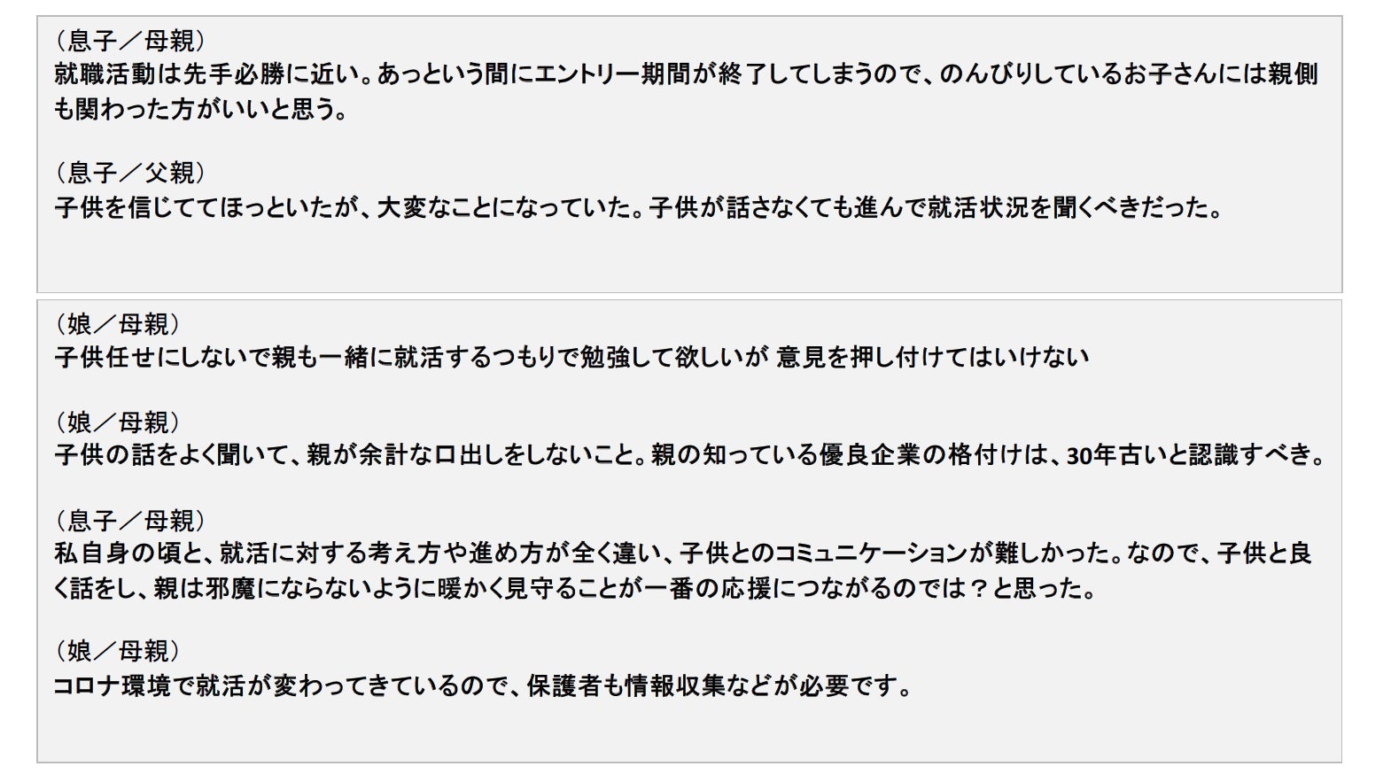 今回の調査では、バブル期に就職活動を経験した保護者と、就職氷河期に就職活動を経験した保護者との間での、子どもの就職活動に対する感じ方に違いがあることが分かりました。保護者の就職活動当時の経験や価値観によっては、子どもの活動の進捗が良く見えたり悪く見えたりするかもしれませんが、「意見を押し付けてはいけない」、「親の知っている優良企業の格付けは、30年古いと認識すべき」というコメントにもあるように、保護者側が環境・価値観の違いを受け入れて、理解することが必要です。そのためには、現在の就職活動に対する情報収集をしたり、子どもとのコミュニケーションをとり理解を深めながら、就職活動のサポートを行うことが重要だと考えます。