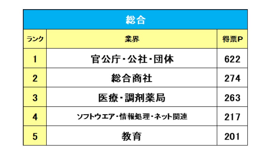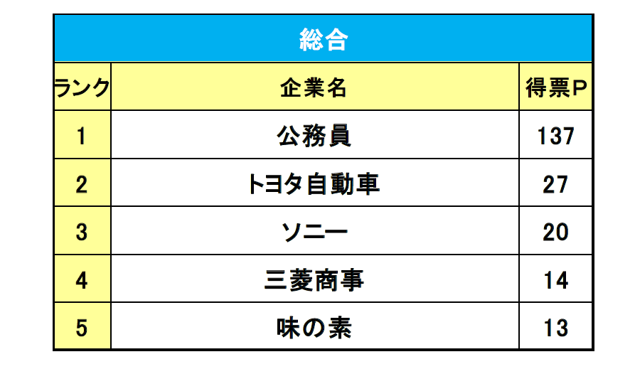 有効回答数530のうち上位を獲得票数順に表示、官公庁、地方自治体等はすべて公務員として集計