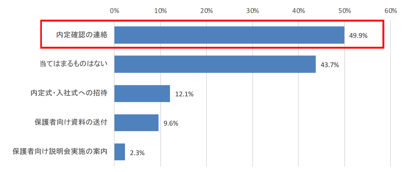 子どもの内定先企業から「親・保護者へ内定受諾に関する確認の連絡(オヤカク)」を受けたという回答は49.9%と約半数に上った。そのほか、「内定式・入社式への招待」(12.1%)、「保護者向け資料の送付」(9.6%)という回答もあり、学生への内定フォローだけでなく、保護者に向けたフォローを行う企業もあるようだ。【図5】
