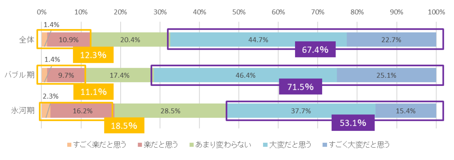 - 自身の就職活動と比べて、子どもの就職活動を大変だと思う保護者は67.4%。就職氷河期よりもバブル期に就活をした世代のほうが「大変」と感じる割合が高い【図6】