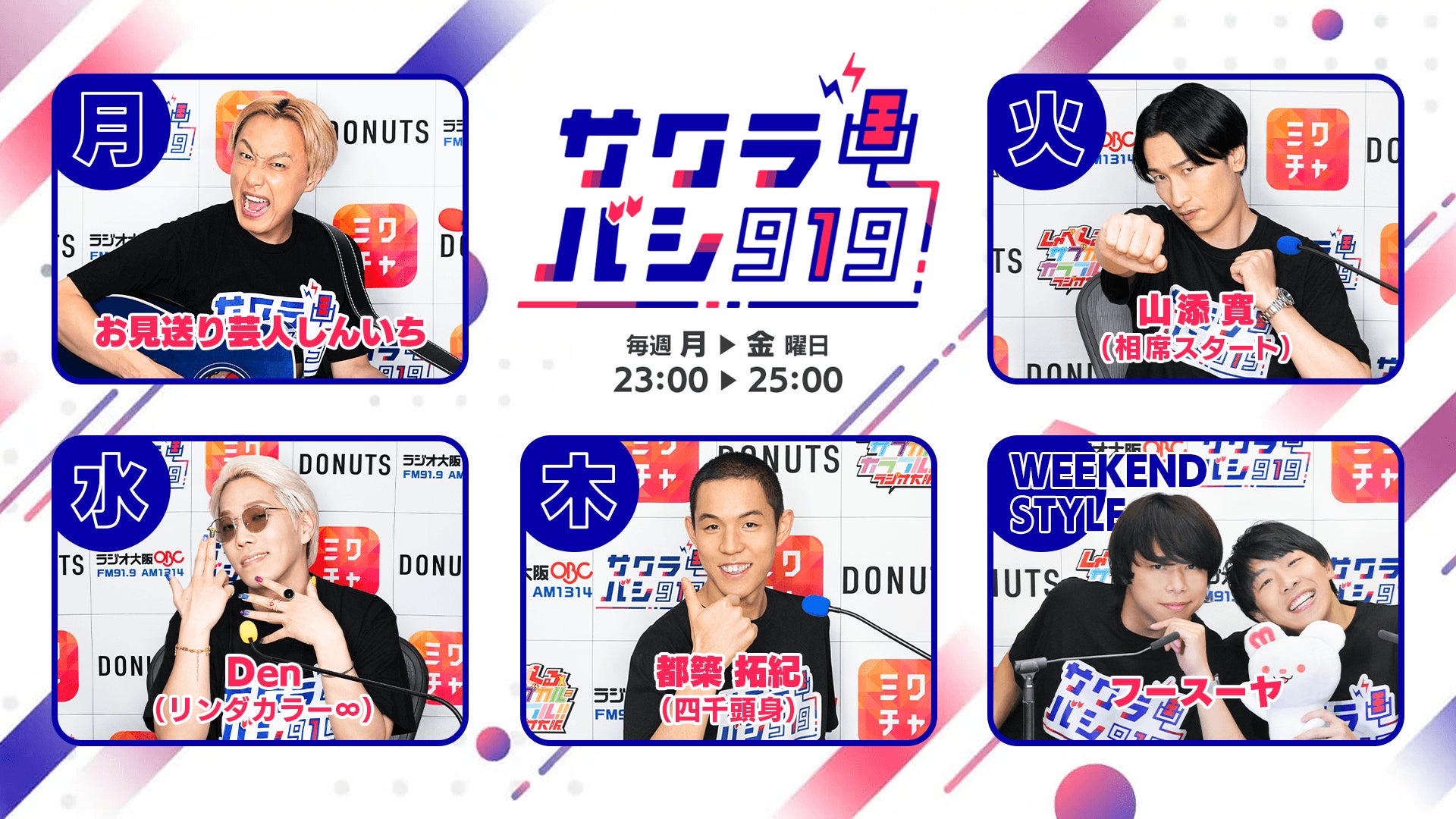 深夜のラジオ番組『サクラバシ919』春からの新パーソナリティ発表!お見送り芸人しんいちとリンダカラー∞のDenが加わり、笑いの絶えない2時間をお届け!
