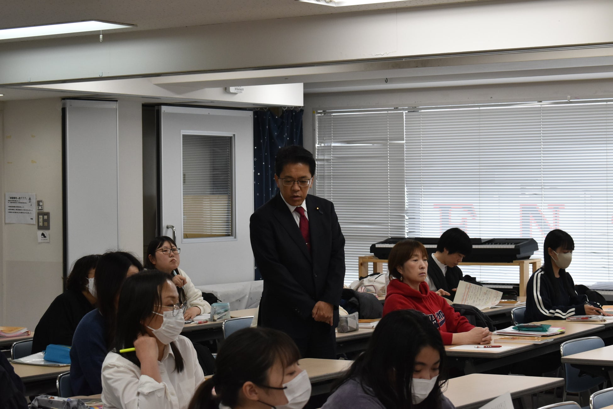 当日は、チャイルドケアカレッジこども保育専攻に通う学生3名と当社の久永校長をはじめとした関係者3名が参加し、宮﨑副大臣と意見交換させていただきました。