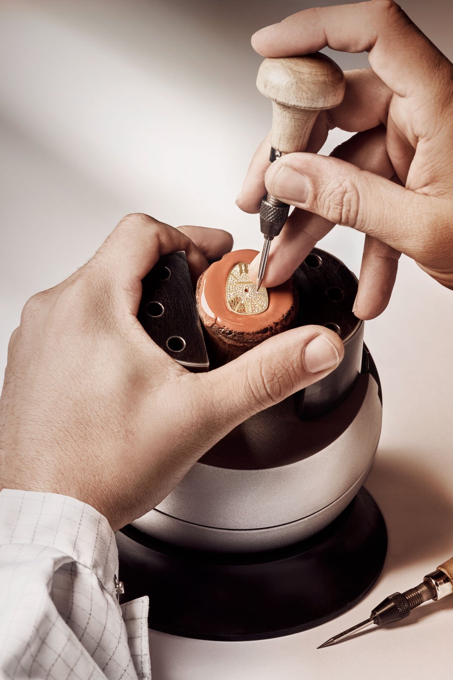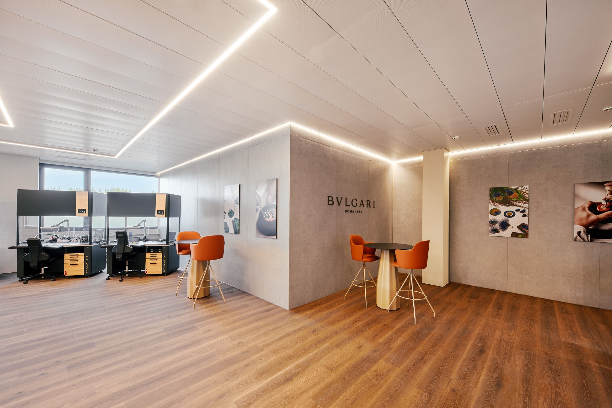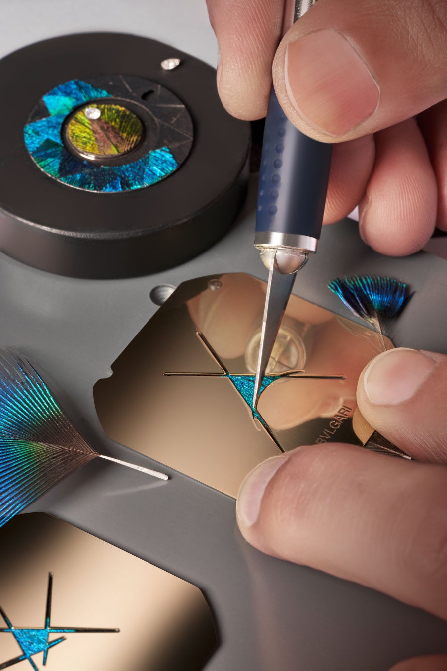 ブルガリを象徴するコレクションである「セルペンティ」「オクト フィニッシモ」「ブルガリ・ブルガリ」、そしてハイジュエリーウォッチの功績により、伝統的なメティエダール (芸術的かつ工芸的な技法) で作り出されたダイヤルがさらに求められるようになっています。希少な専門知識と芸術的技術の融合から生まれたこれらのダイヤルは、ハードストーンと孔雀の羽それぞれのマルケトリ、色石のセッティング、マイクロペインティングに特化した部門で製作されるようになります。クラフツマンシップが発揮される場にふさわしい静寂と落ち着きに満たされたこの新しいスペースには、ダイナミックな流れと呼応力、クリエイティビティが息づいています。