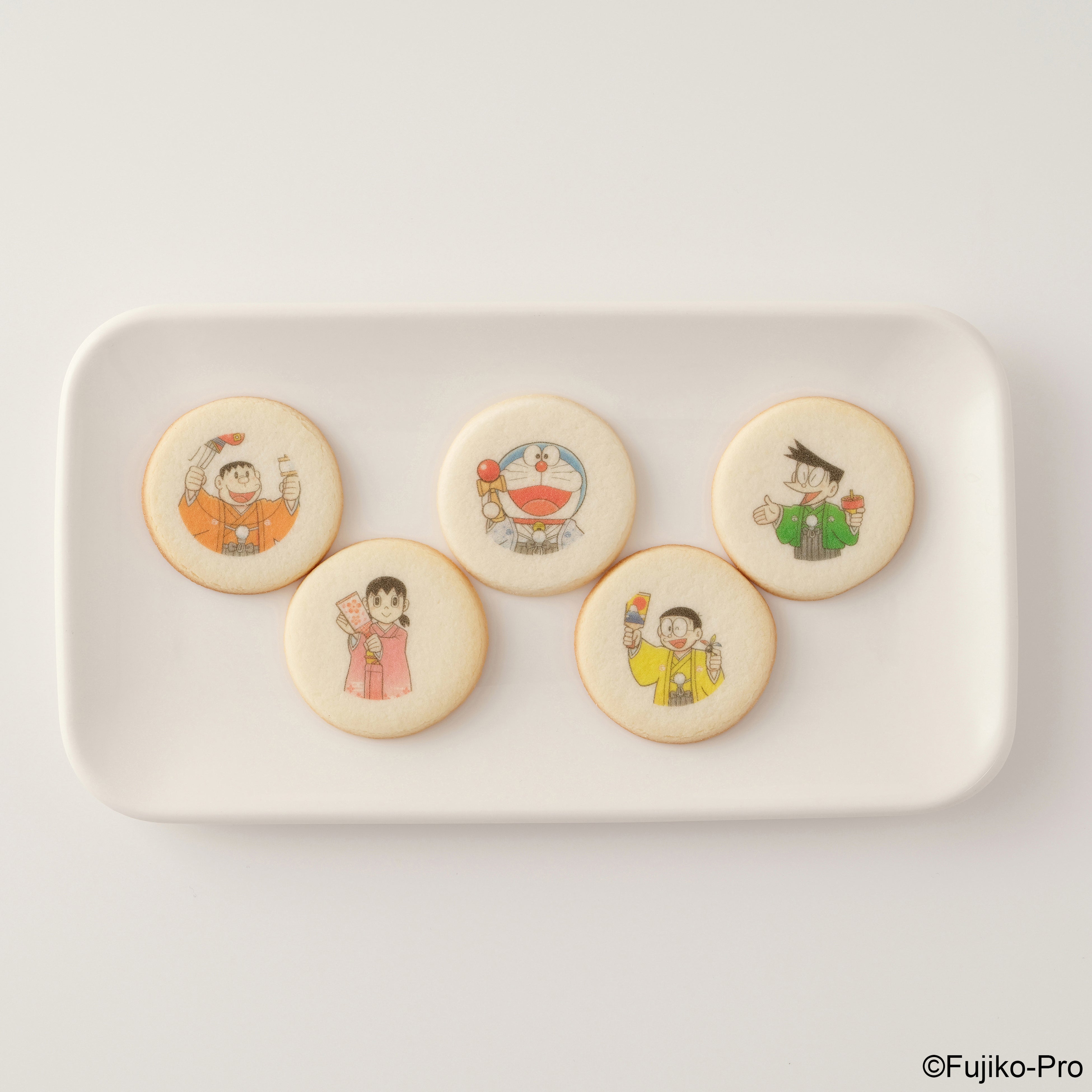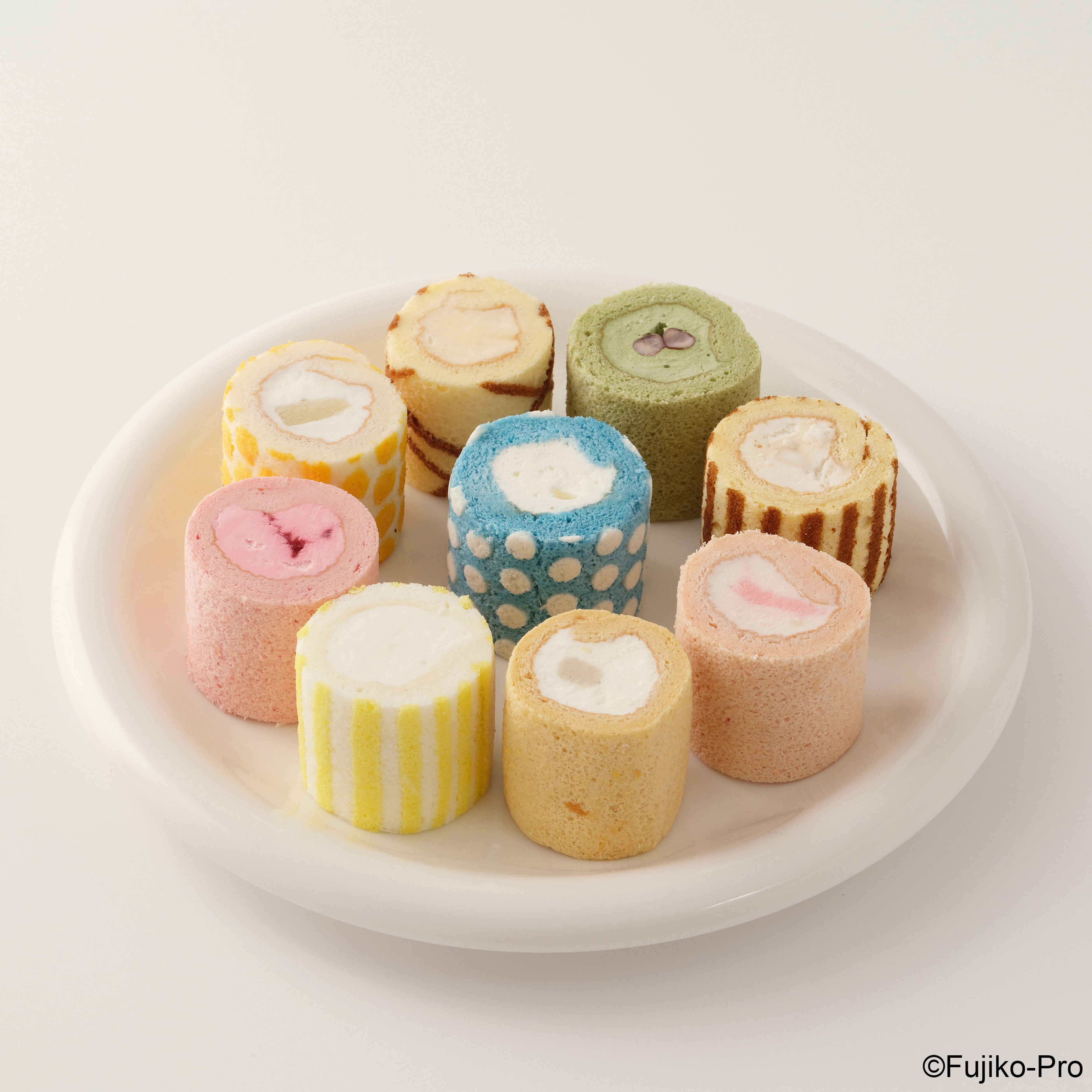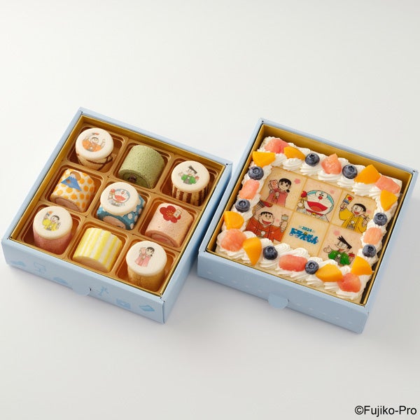 一の重「お正月特別イラストのフルーツケーキ」は、今回のために特別に描かれた、ドラえもん、のび太、しずか、ジャイアン、スネ夫のお正月らしいイラストをホワイトチョコレートプレートにプリントし、まわりにフルーツをあしらったスクエアケーキ。二の重「9種のロールケーキ」は、プリン、抹茶、みたらし、ヨーグルト、生クリーム、白桃、ベリー、レモン、和栗の9種類のロールケーキに、おなじみのキャラクターがプリントされたホワイトクッキーを乗せ、詰め合わせました。
