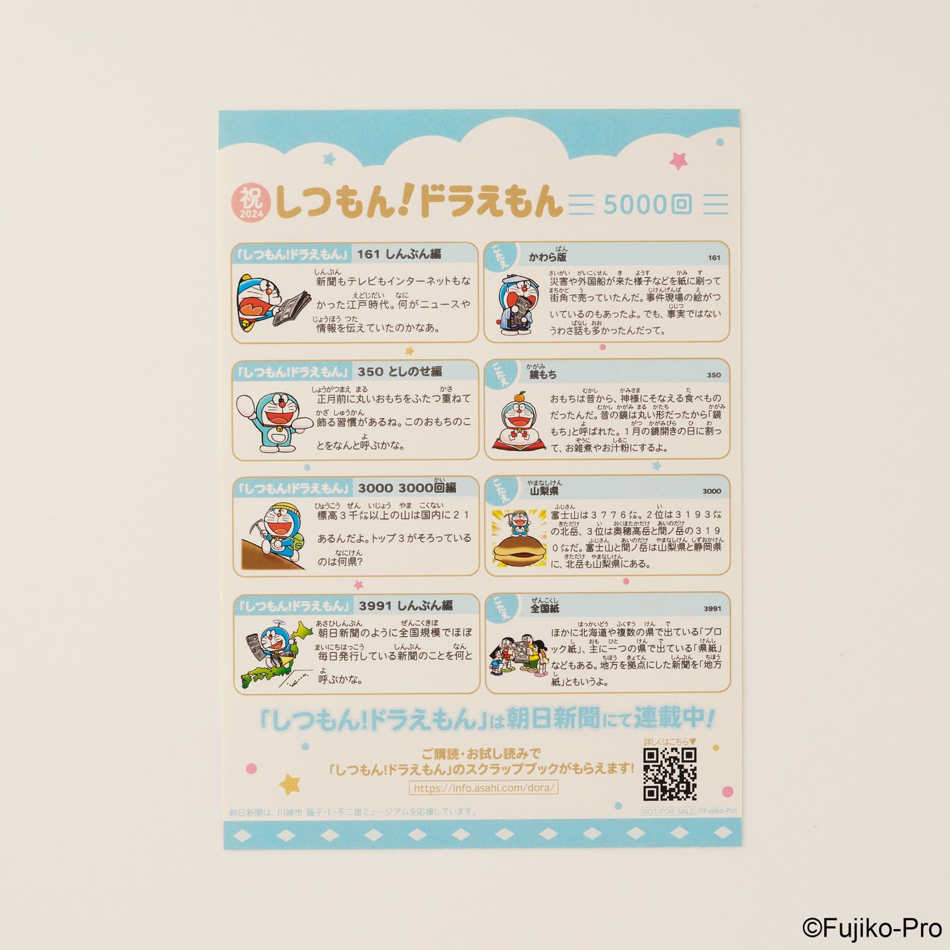 「しつもん!ドラえもん」は、朝日新聞朝刊に掲載されているクイズです。1面に「しつもん」が載り、「こたえ」は別ページに載っています。どこのページにあるかは新聞を開いてのお楽しみ。学校で習うテーマや身近な話題から幅広く出題しています。