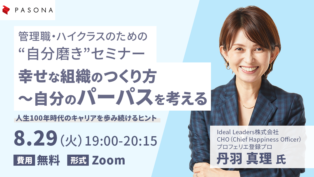パソナ×プロフェリエ 管理職ハイクラスのための“自分磨き”セミナー 『幸せな組織のつくり方〜自分のパーパスを考える』8月29日開催