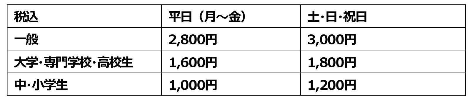 ※未就学児は無料、日時指定予約は不要です。※障がい者手帳をお持ちの方とその付き添いの方1名は当日料金の半額となります。