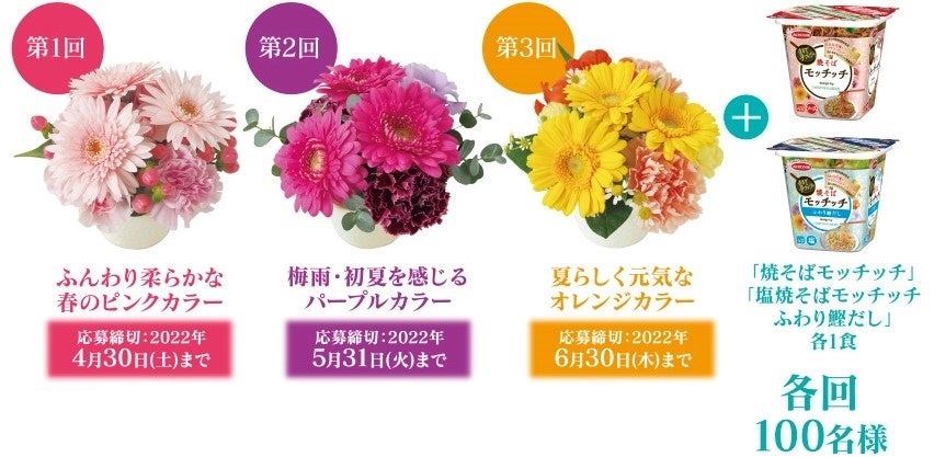 ② LINEからクイズに答えて応募すると、季節のフラワーアレンジメントと焼そばモッチッチのセットが抽選で合計300名様に当たるプレゼントキャンペーン!