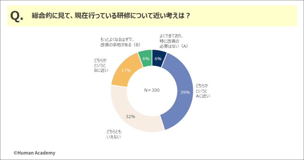 また、現在の研修がよくできており改善の必要性はない(図表2:A)と答えた研修担当者は6%、どちらかというとAに近いと答えた研修担当者は39%でした。この結果から45%の担当者は、現在の研修に対して肯定的な回答をしていることがわかります。