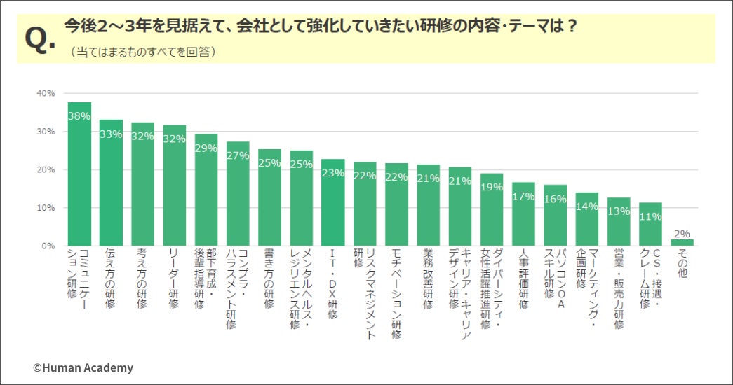 現在も今後も強化したい研修テーマはコミュニケーション研修38%が1位