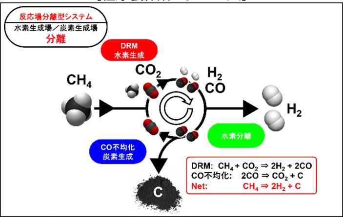 独自開発した触媒を用いた革新的なガス循環反応により、メタンと二酸化炭素の混合ガスから水素を抽出すると同時に、高付加価値炭素を製造するシステムを開発します。安価な水素価格を実現し、CCSに依存する事なく、経済合理性を担保しながら温室効果ガス濃度の低減を果たすことが可能になります。