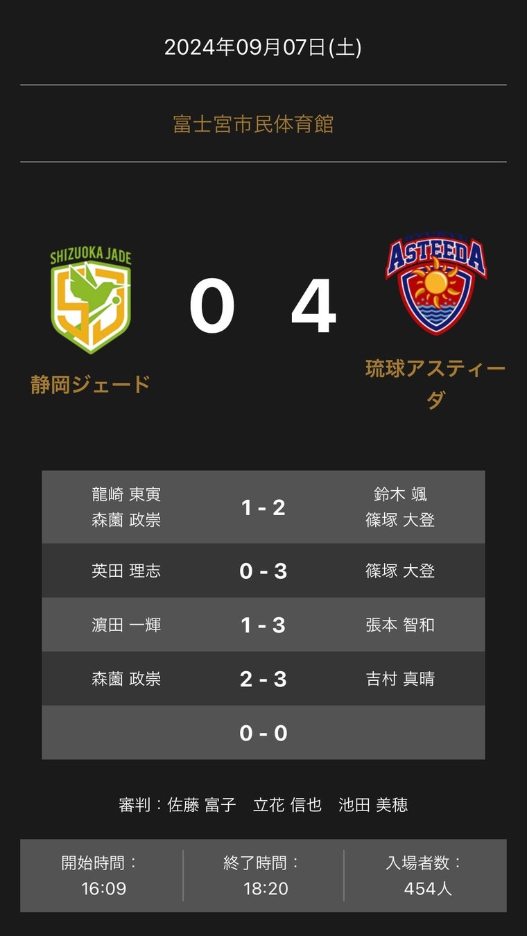 静岡ジェードと琉球アスティーダの試合は、4-0で琉球アスティーダが勝利しました。