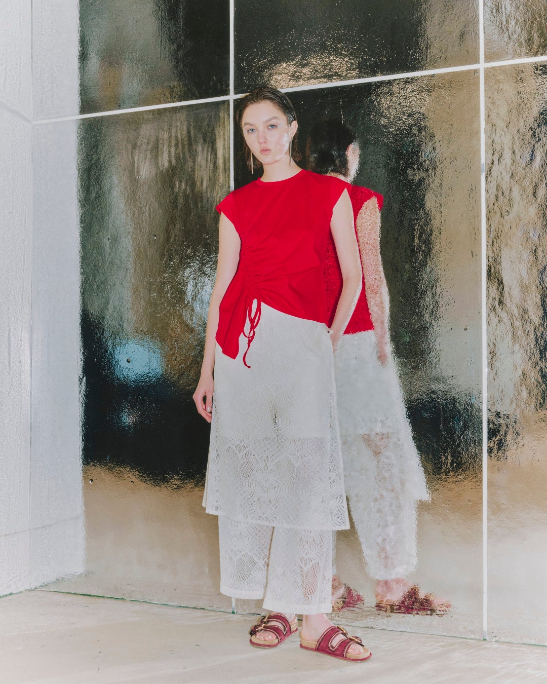 シーズンを締めくくる2025 SPRING/SUMMER COLLECTION第3弾のLOOK BOOKでは、GALLESTが得意とするスポーティーさを取り入れたワンピースや1枚で決まるオーバーオール、目を引くビビッドな赤のカットソーやレイヤードスタイルを楽しめるレースパンツのアイテムなど、GALLESTらしい夏のモードスタイルをご提案いたします。