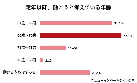 定年以降の働く意向について聞いたところ、63.4%が「定年以降も働こうと考えている」と回答しました。また、定年以降も働こうと考えている634名に「何歳まで働こうと考えているか」を聞くと、「66歳~70歳(35.2%)」が一番多く、次いで「61歳~65歳(31.1%)」という結果となりました。一般的な定年後5~10年程度、継続して働く意向が見受けられますが、「働けるうちはずっと」と回答した人も21.5%いました。