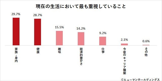 「現在の生活において最も重視していること」については、「家族・身内(29.7%)」「健康(28.7%)」が多い結果となりました。自分自身や、身近な人に対する意識が強い傾向が見られます。