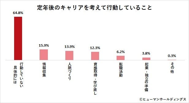 定年後のキャリアを考えて、何か行動しているか質問すると、64.8%が「具体的には行動していない」と回答。「資格取得・学び直し(12.3%)」「転職活動(6.2%)」「起業・独立の準備(3.8%)」など、定年後を見据えて50代から動き始めている人は少ないようです。