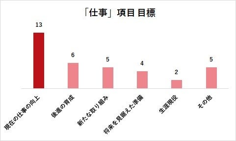 「人生目標」を達成するために必要な8大分野の各項目の中で一様の傾向があったのは「仕事」の項目で、13名が【現在の仕事の向上】系目標を設定しています。「現在の仕事内容においての理解を深めリーダーシップを高める」「リーダーシップ能力の向上」「一丸となるチーム作り」など、現在の仕事におけるマネジメント能力の向上を重視しているようです。