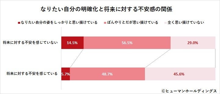加えて、なりたい自分の姿を思い描がけている人と思い描けていない人では、なりたい自分の姿を思い描けている人は将来に対して不安を感じていない傾向が見られます。