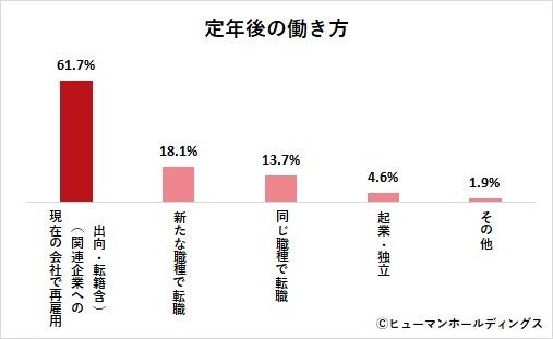 また、「定年後の働き方」としては、「現在の会社での再雇用」を考えている人が最も多く61.7%という結果でした。