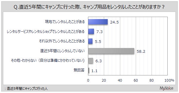 直近5年間にキャンプに行った人のうち、キャンプ用品をレンタルしたことがある人は3割強です。