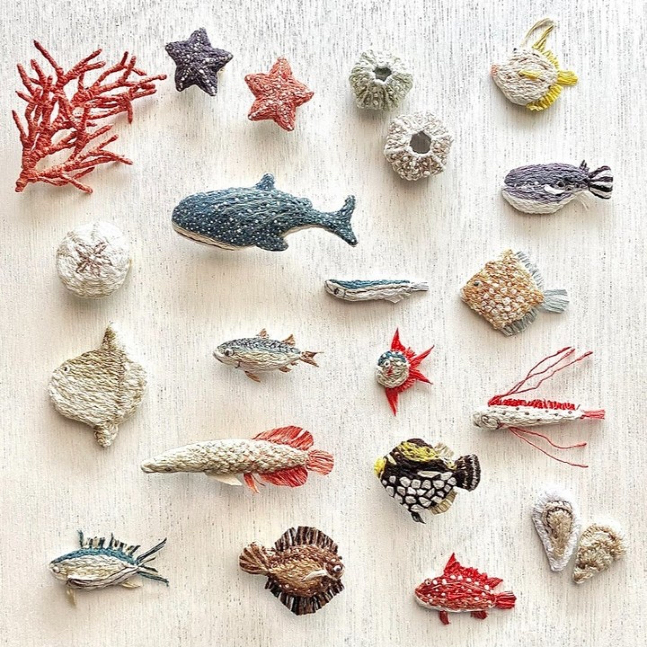 色にこだわって作った魚のブローチや一色刺繍で表現するクラゲのブラウスやバックなどが代表作。
