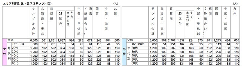 ※男女それぞれ、年齢5歳刻みで均等割付(エリアと年代による割付数詳細は下記数表を参照)