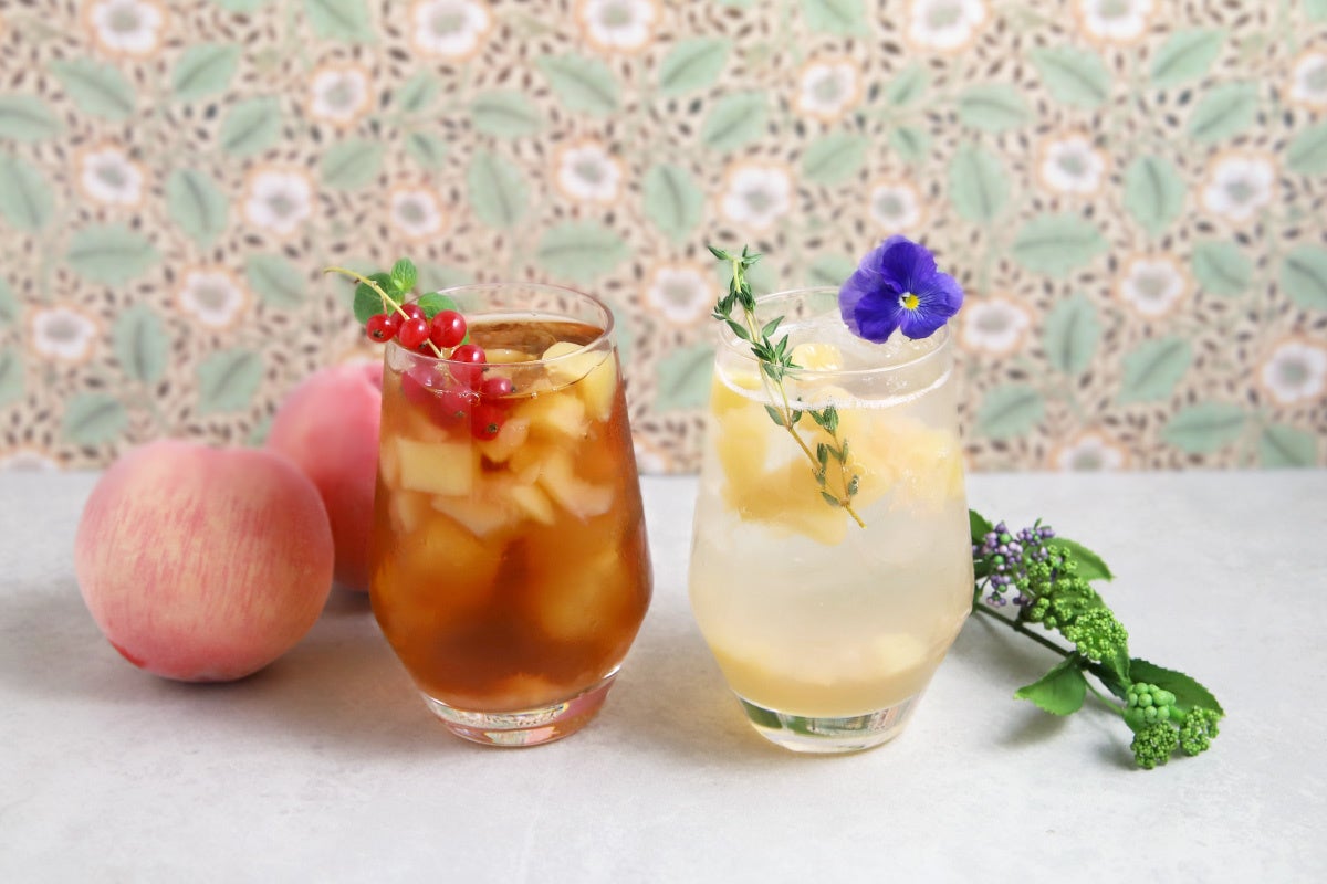 ダイスカットした桃が入った食感豊かな白桃ソースを、ピーチティーはすっきりとした甘みのフレーバーティーと。レモネードはすっきり爽やかなレモネードと合わせた夏のスイーツドリンクです。