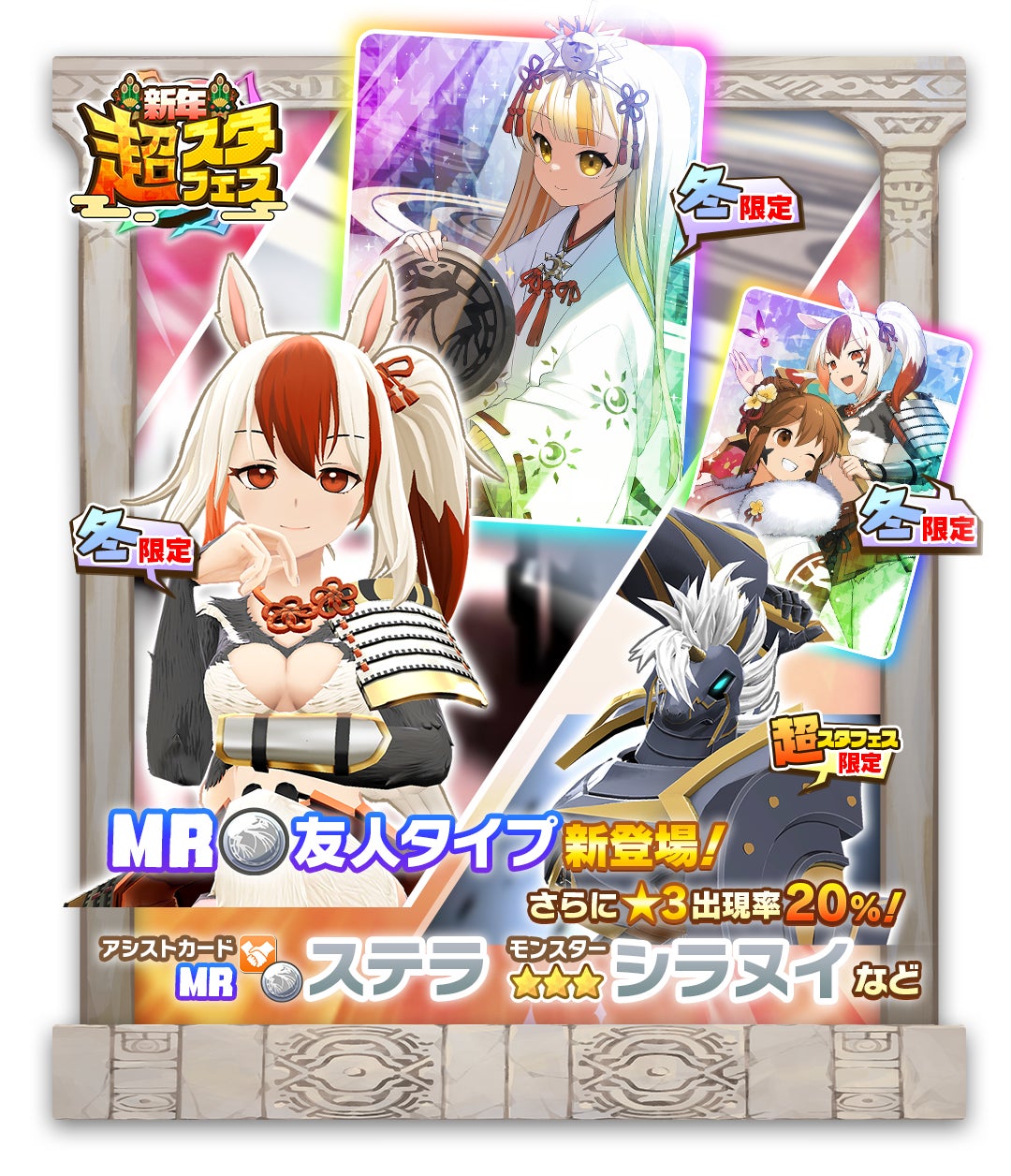12月31日(水)開催のガチャイベント「新年超スタフェス」では、新モンスター2種、新アシストカード2種が登場します。新★3モンスターにピクシー種「シラヌイ」とデュラハン種「タクティクス」の2種、新アシストカードにライフ&回避のタイプの「サバイブ」で登場するMR「コルト&ナデシコ」と「【神聖な巫女姿】ステラ」の2種が登場します。ほかにも「ソロモンクエスト」や、育成ランキングイベント「モンスターグランプリ」も開催します。