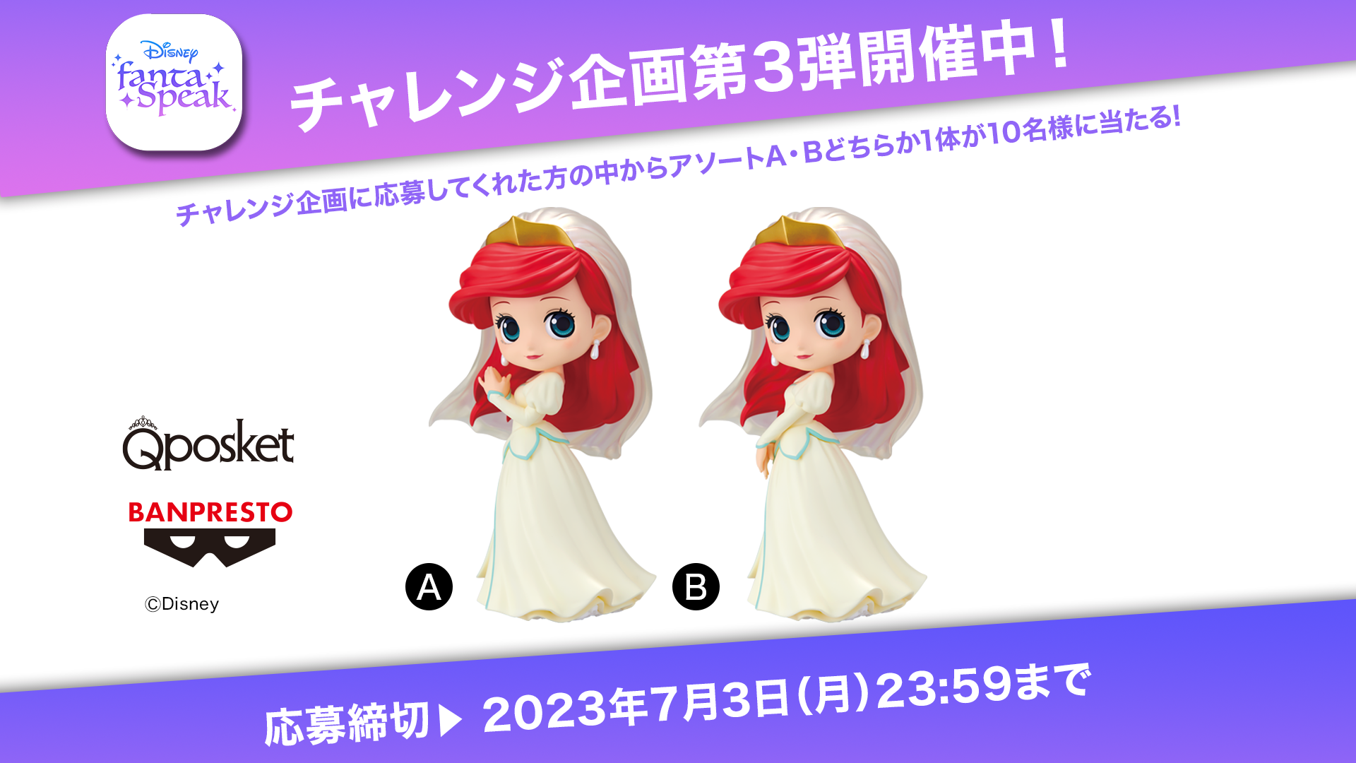 本アプリの「Stories」のコーナーに収録している『塔の上のラプンツェル』『アラジン』そして今回6月13日(火)に新タイトルとして公開された『リトル・マーメイド』のいずれか1作品を選び、一定の条件を満たすと、「Q posket」の『リトル・マーメイド』「アリエル」のフィギュアが抽選で当たります。