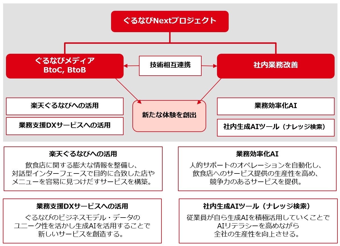 ぐるなびは、生成AIを活用しぐるなび全体の技術革新・DXを実現する「ぐるなびNextプロジェクト」を2024年8月より推進しています。今後も、「食でつなぐ。人を満たす。」というPURPOSE(存在意義)のもと、社内外におけるAIの活用を拡充し、「次世代食体験の実現」と「圧倒的な業務効率化」を加速させてまいります。
